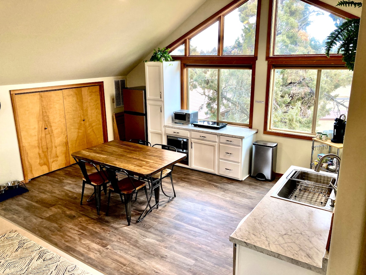 ¡La suite Treehouse Guest está enclavada en los árboles de la hermosa comunidad de Tumalo, Oregón! Tumalo, a 10 minutos en coche al oeste de Bend, es famosa por su belleza, que incluye un fácil acceso a rutas de senderismo y ciclismo. Tu suite de invitados de estilo artesanal de dos pisos está rodeada de árboles e incluye entrada privada, garaje y terraza. Nuestra granja tiene vistas panorámicas a las montañas Cascade. Durante el verano, los huéspedes pueden disfrutar de nuestro jardín inglés, estanque y alpacas en el campo.