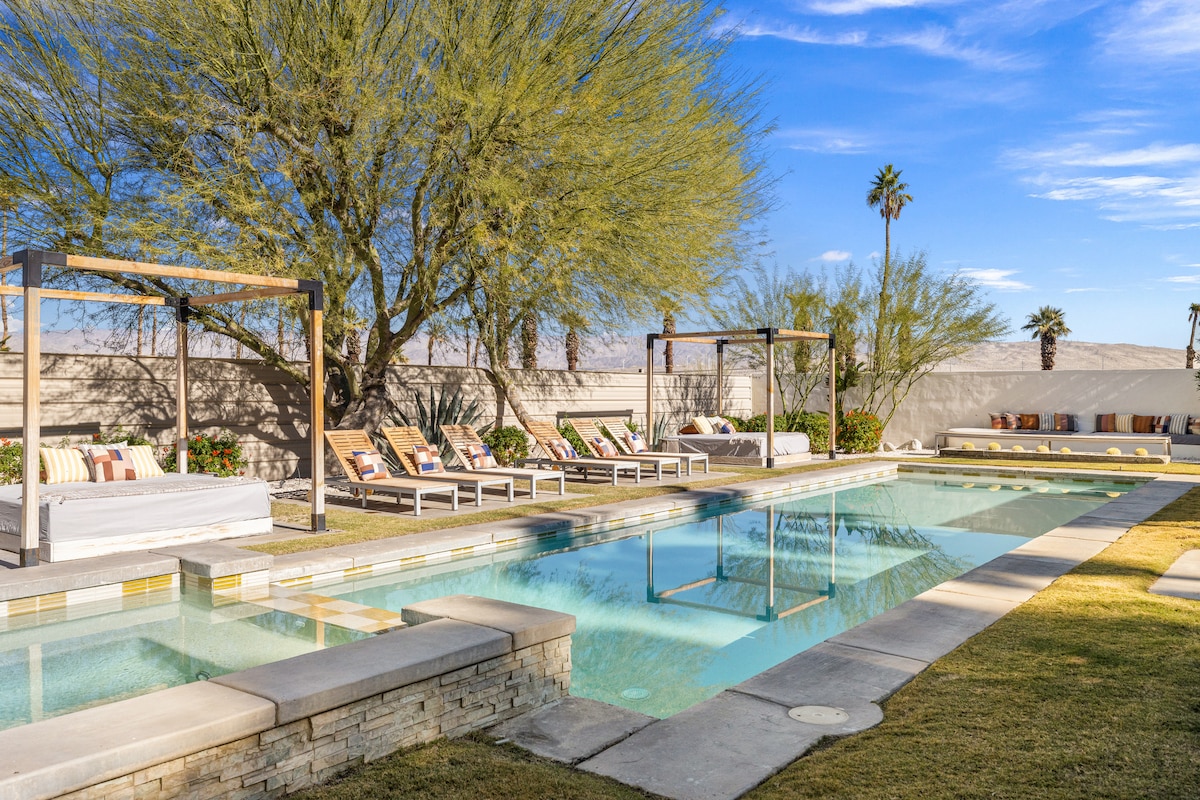 Welcome to Palm Peach, a Wes Anderson-inspired desert fiesta filled with colors and characters, perfect for 8 guests. Sun bathe on handmade lounge chairs by the pool in a resort-style backyard. Dip in the large saltwater pool. Enjoy a hot spa under the stars. Or gather around the fireplace to ward off chills. Experience a most unique blacklight game & theater room with a blacklight mural, an 8ft pool table, karaoke, Simpsons arcade & more.