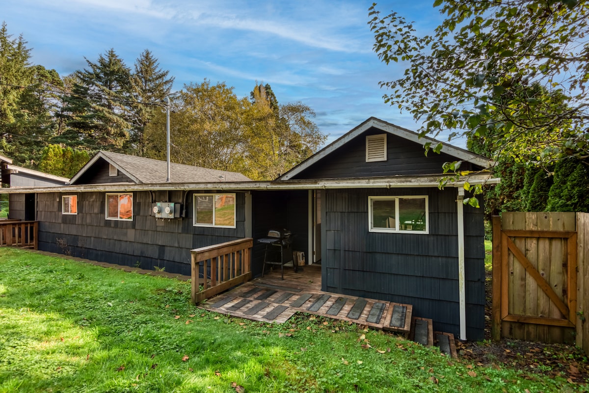 Oceanfront cottage in Depoe Bay with panoramic views above Pirate Cove. This charming one-bedroom, one-bath retreat sleeps up to 4 and blends cozy 1930s character with modern comfort. Fall asleep to the sound of waves and wake with coffee on the deck while watching whales, seals, and bald eagles pass by. Just off HWY 101 and close to Depoe Bay’s harbor, shops, and restaurants. Fully stocked with thoughtful amenities, plus a Tesla charger on site.