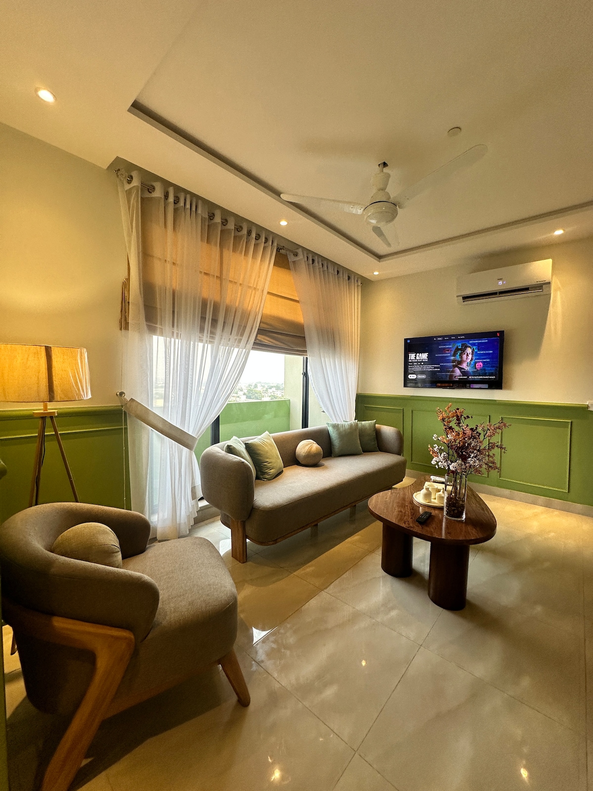 Este apartamento acogedor y bien cuidado se encuentra en el corazón de Gulberg, una de las zonas más céntricas y seguras de la ciudad. Ideal tanto para estancias cortas como largas, el espacio está cuidadosamente diseñado para ofrecer comodidad y conveniencia. En el salón hay instalado un televisor de 65 pulgadas para que te relajes. También hay un comedor de 1,77 m para satisfacer tus necesidades de hambre. Un gran SOFÁ de BOUCLE para ofrecerte las sensaciones prémium que te mereces.