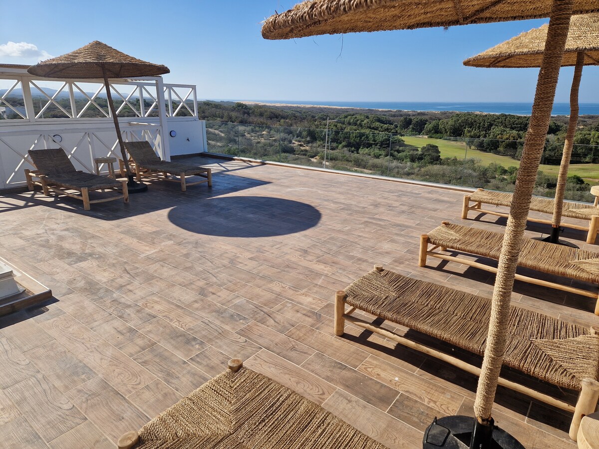 ¡En un lugar único con impresionantes vistas de Essaouira, las islas de Mogador, las playas y el golf! ¡A 5 km de la medina de Essaouira, a 2 km del golf y a 1 km de los círculos hípicos y de alquiler de quads! ¡En el primer nivel de un edificio de 2 niveles, todo nuevo apartamento de alto nivel! ¡Gran living, 3 h y 2 sdb! Entrada privada y llena de consejos para pasar una agradable estancia en Essaouira.
