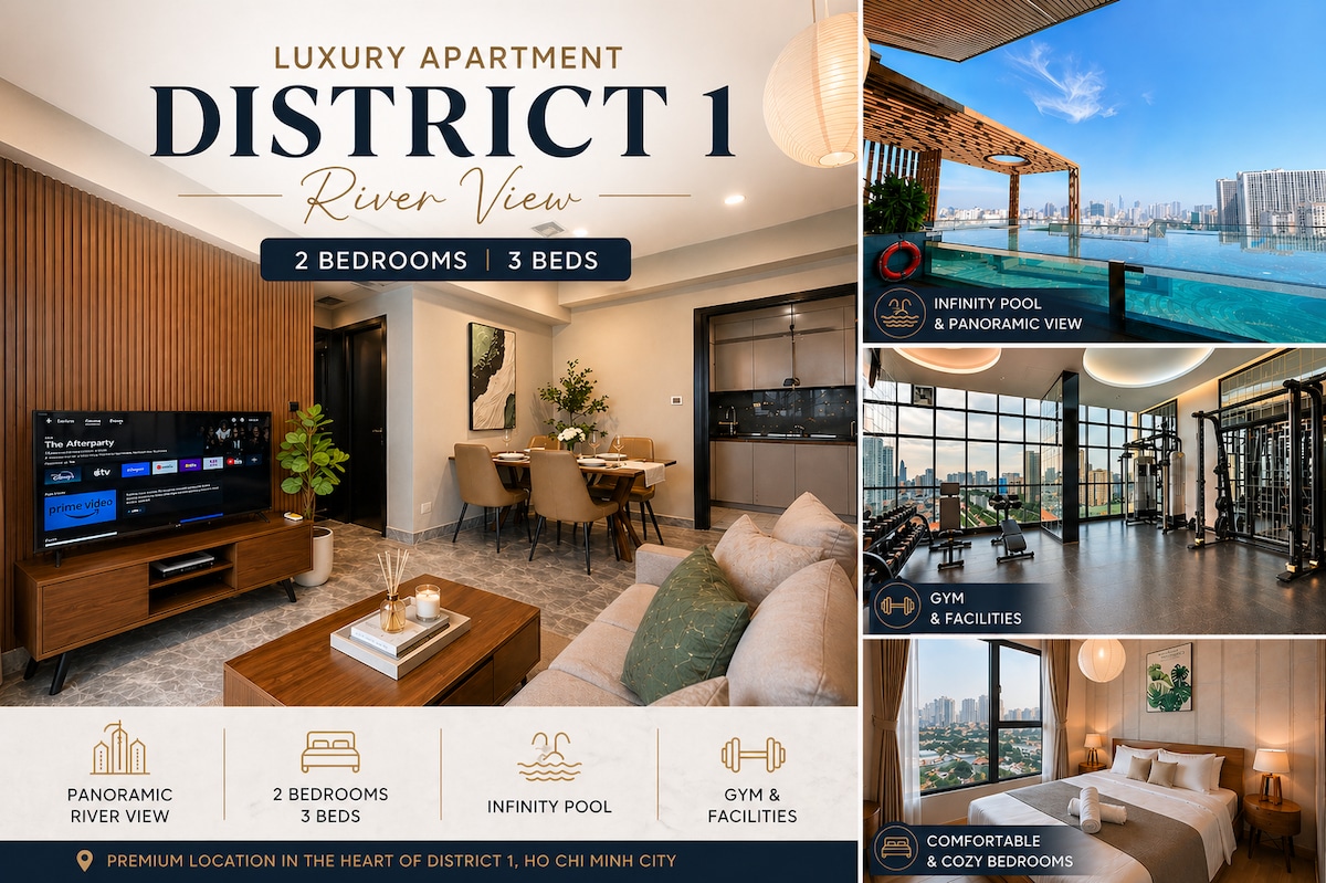 🌿 Experience breathtaking fireworks without the crowds, right from the comfort of your home. Relax with a glass of wine as the sky lights up — a truly unforgettable stay. 🌿 This spacious 2-bedroom corner apartment in Diamond Island, offers a serene escape with breathtaking views of the Saigon River and the shimmering city skyline — where you can witness both the peaceful sunrise and the golden glow of sunset right from your balcony.