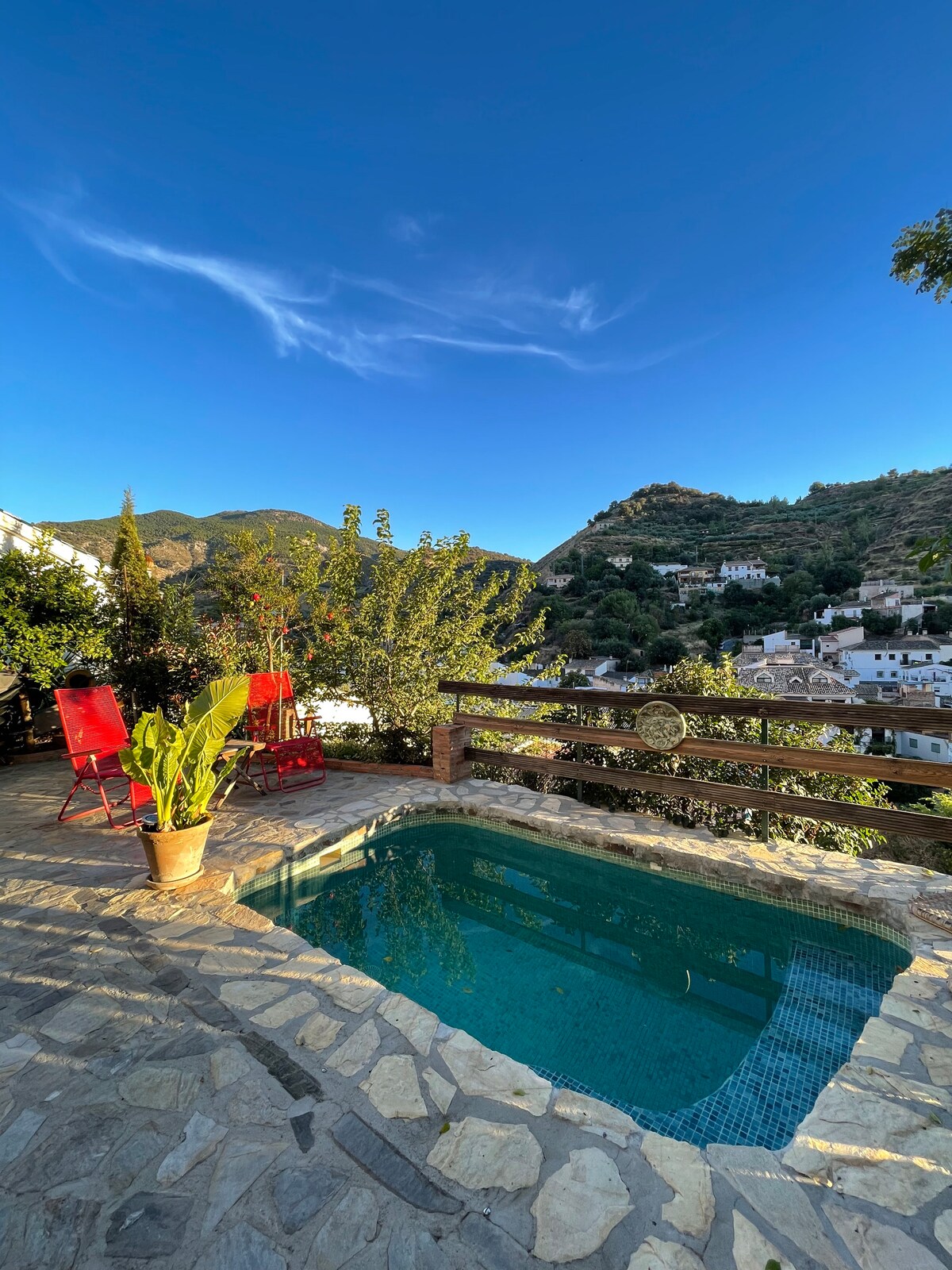 Casa acogedora en un tranquilo y bonito entorno rural de montaña en Granada. Ubicada en un pequeño pueblo junto al Parque Natural de Sierra Nevada, a 25 min de Granada, 20 min de La Alpujarra y 25 min de la playa. La casa tiene dos plantas y un patio exterior con pequeña piscina, exclusivo para ti. Planta de abajo: distribución abierta con salón, comedor, cocina, pequeño aseo y patio. Planta superior: dormitorios y baño completo. Rutas de senderismo a 5 min a pie desde el alojamiento.