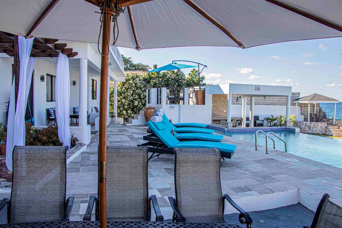 Escápate a esta hermosa propiedad frente a la playa de 2 dormitorios, en una comunidad cerrada, con seguridad las 24 horas, a pocos minutos de Ocho Ríos. Esta villa amueblada con buen gusto, tiene todas las comodidades que uno podría desear, aire acondicionado en todas partes, wifi, TV en todas las habitaciones. La playa en forma de herradura y la gran piscina están a pocos pasos de la villa. Verás las puestas de sol más increíbles desde la terraza solárium de la azotea. Servicios en el lugar; canchas de baloncesto/ tenis, gimnasio y área de juegos para niños. Servicios complementarios de chef interno, sujetos a disponibilidad.