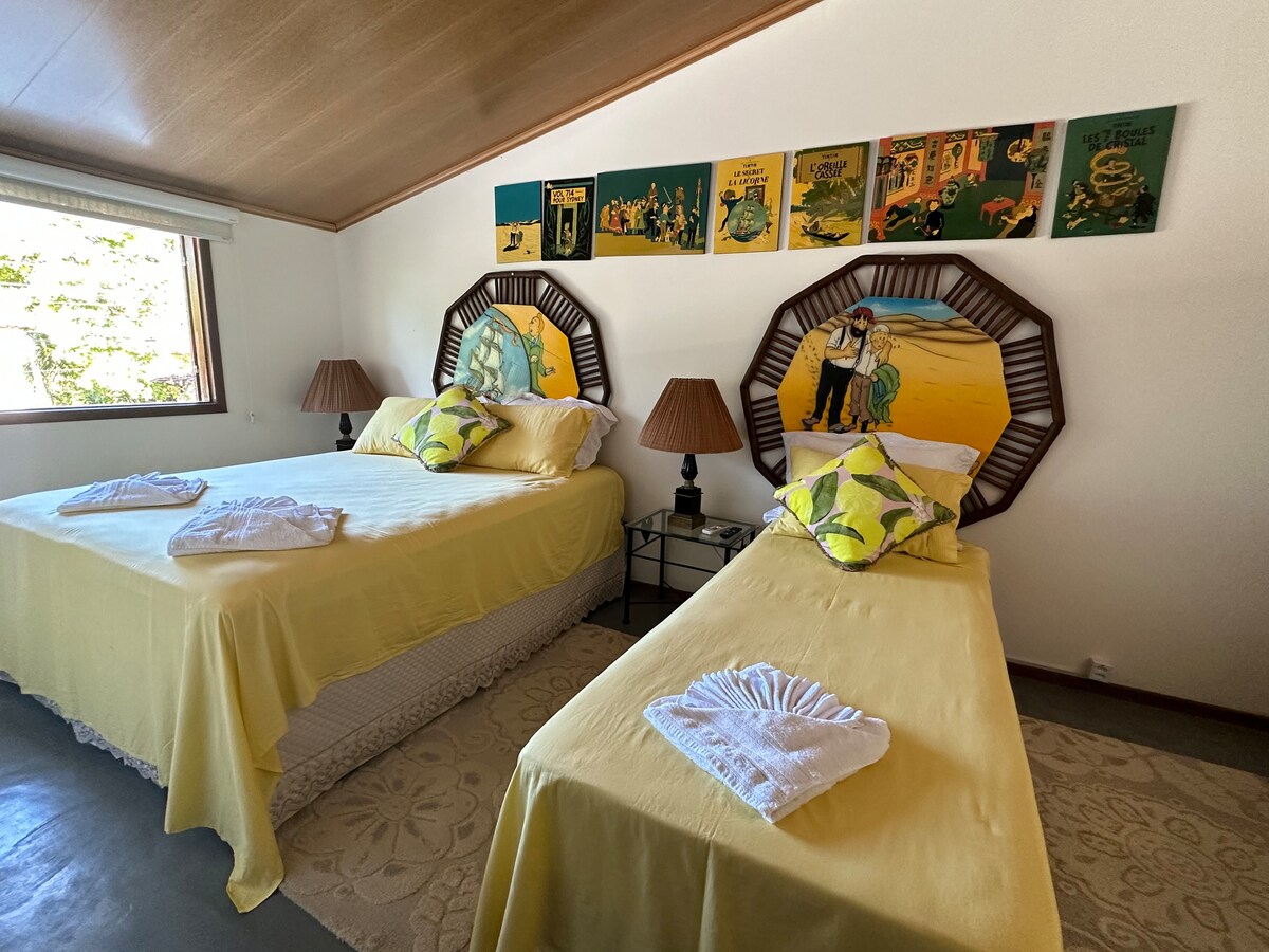 Perfeita para famílias ou amigos, a Suíte Quádrupla no Hotel Boutique Azorai oferece privacidade real: são 2 quartos independentes conectados, um com cama de casal e outro com duas de solteiro. Ambos climatizados e com banheiro compartilhado. Desfrute de um delicioso café da manhã incluso e relaxe em nosso jardim ou na piscina com vista panorâmica para o mar. Conforto e praticità em um ambiente exclusivo. Ideal para quem busca sossego e uma estadia inesquecível. Reserve agora!