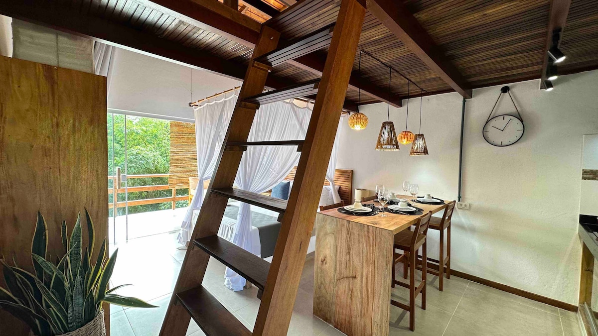 Apartamento lindo e completo, com banheiro exclusivo, cozinha completa e com utensílios domésticos. O quarto fica sob um mezanino lindo, trazendo uma experiência diferente de estadia. E também tem uma ótima varanda com vista para a reserva ambiental. Perfeito para quem precisa fazer home office. Trabalhe um uma internet boa em um lugar confortável. Aceitamos pets, lembre-se de adicionar ele na sua reserva. Dois provedores de internet para redundância.