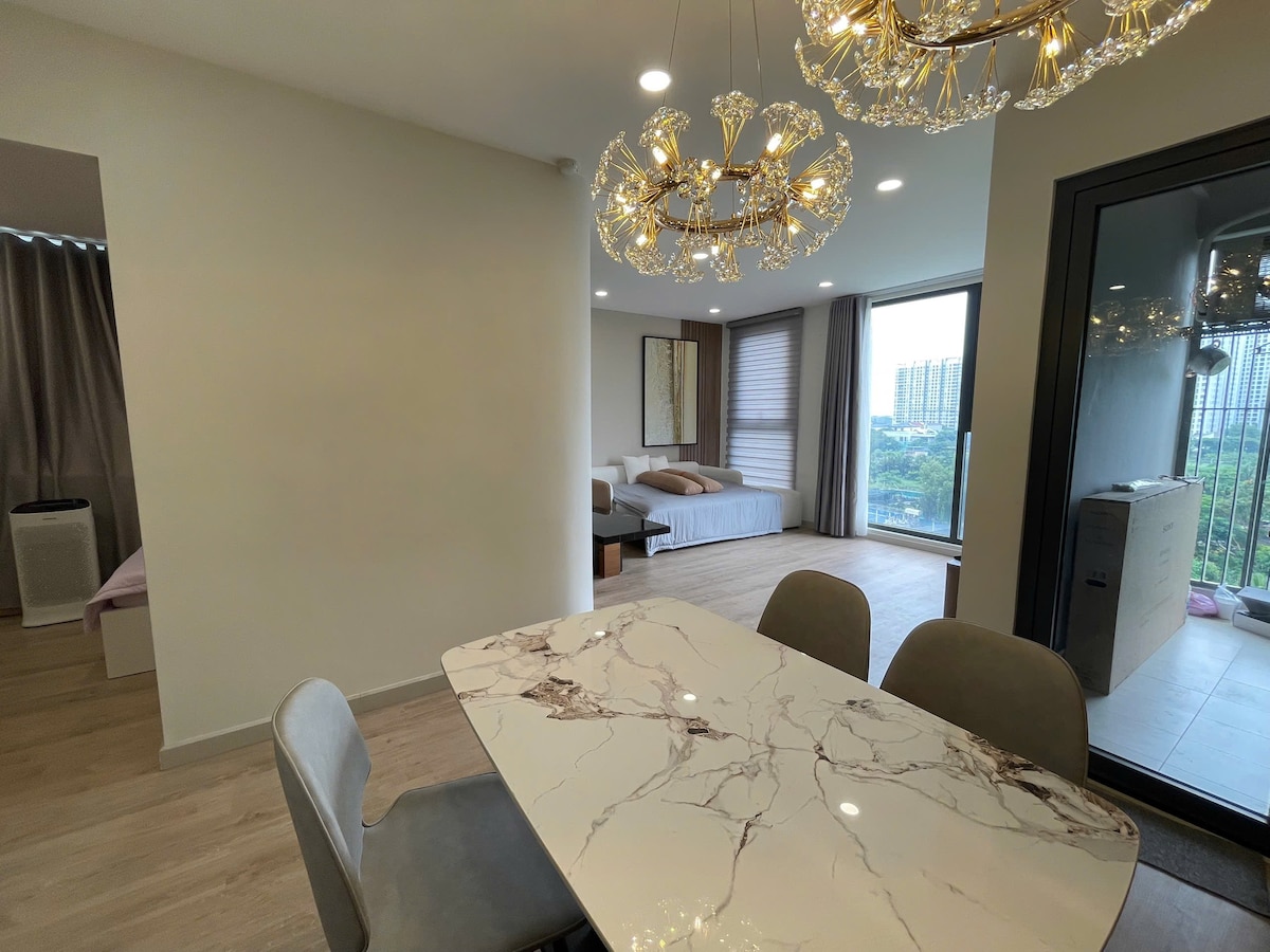 Chúc bạn có một căn hộ mới hiện đại, đầy đủ tiện nghi, tầm nhìn tuyệt đẹp ra thành phố, Landmark 81 và sông Sài Gòn. Căn hộ 70 m2 này có hai phòng ngủ, 1 giường king, 1 giường queen và 2 phòng tắm với tầm nhìn toàn cảnh thành phố tuyệt vời từ ban công và phòng ngủ. Rất yên tĩnh cho khách đi công tác và/hoặc giải trí. Chỉ vài phút đến Phú Mỹ Hưng, khu đô thị hiện đại hàng đầu của đất nước, nơi có vô số nhà hàng, quán cà phê, trung tâm mua sắm, trường quốc tế hàng đầu và các dịch vụ khác