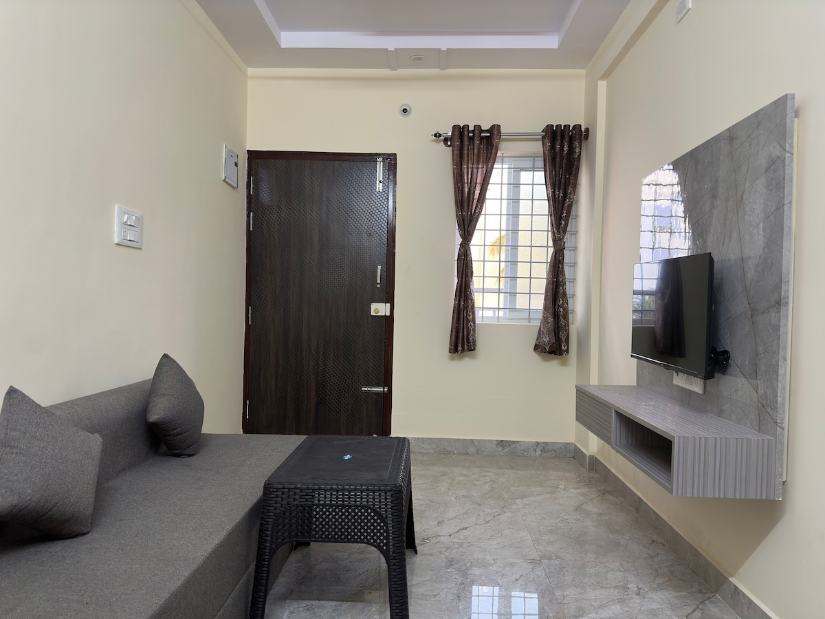 Te damos la bienvenida a AJ's Style, un acogedor hogar diseñado para que te sientas cálido y cómodo. Disfruta de tu propio 1BHK privado con un dormitorio con aire acondicionado, espacio de trabajo con Wi-Fi, cocina, baño y balcón. Ya sea que viajes en pareja, por trabajo o por tu cuenta, el espacio está preparado para que disfrutes de la comodidad, la tranquilidad y la facilidad. Estamos ubicados en Electronic City Phase 1, cerca de parques de TI, cafés, pubs y centros comerciales, lo que facilita el equilibrio entre el trabajo y la relajación. Siéntete como en casa, ¡nos emociona mucho recibirte!