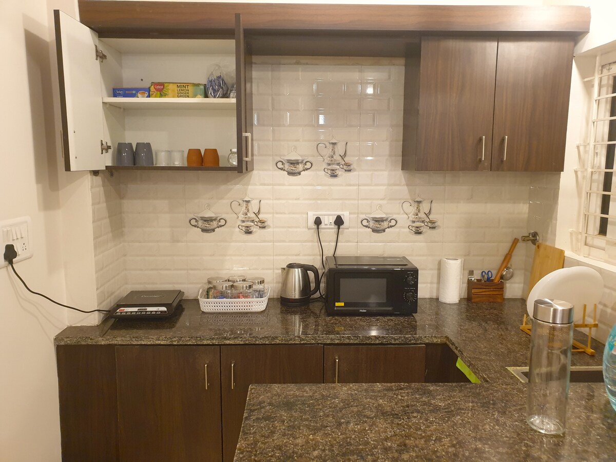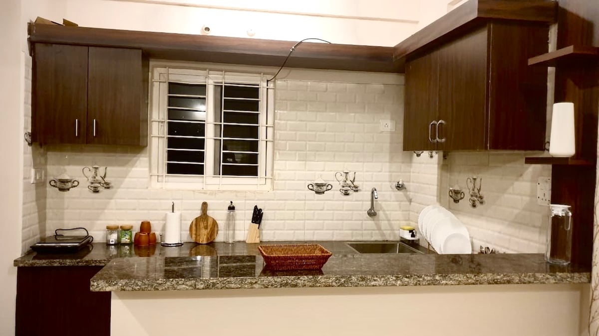 Spacious 1BHK apartment, well suited for family, kids, infants and solo travlers, Infosys joinees; with all in-house amenities including functioning kitchen including gas stove, cooking utensils,mixer, fridge, breakfast counte etc. dedicated internet, AC ,washing machin, recently renovated bathroom, spacious open view balcany with dining table. fully coverd glass and mesh safeguard for mosquitos insects. It's at 2nd floor. Recommended to use staircase, lift might be very slow/ooperation issue.