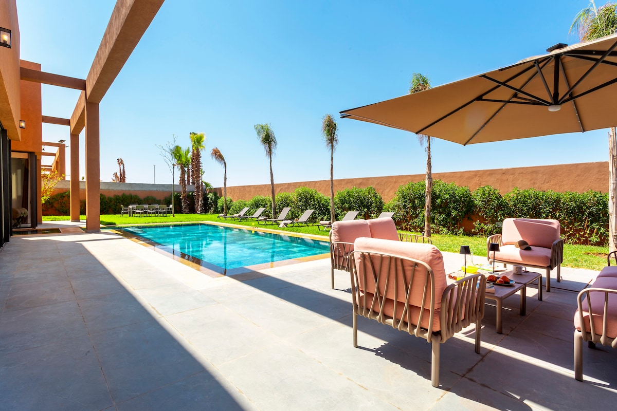 Descubre esta magnífica villa de una sola planta en Marrakech, un verdadero remanso de paz. Ofrece 4 amplias habitaciones con sus 4 baños privados, un elegante salón luminoso, un patio agradable y una cocina moderna totalmente equipada. Disfruta de su piscina climatizada rodeada de un amplio jardín verde. Tranquilidad, comodidad e intimidad garantizadas para una estancia de ensueño, entre la relajación absoluta y momentos inolvidables. Situada en el sur de la ciudad, cerca de los campos de golf, esta villa es simplemente sublime.