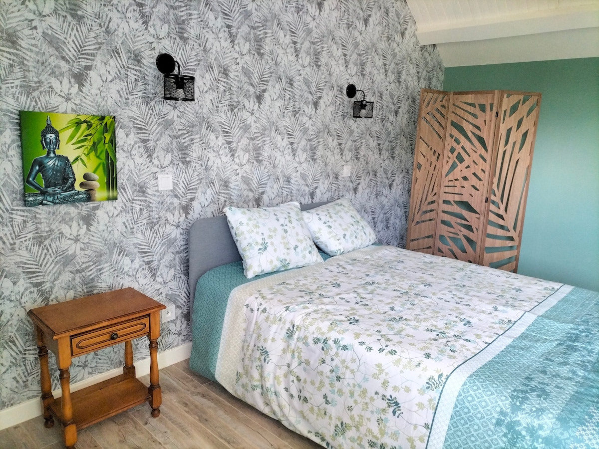Estudio independiente y elegante de 48 m² en una casa unifamiliar, con capacidad para 2 personas. Está equipado con una cocina americana, un dormitorio, una zona de escritorio, una zona de estar con TV y un baño y aseo separados (cuna y sillón a petición). Una zona de relax para descubrir ;) Toallas y ropa de cama incluidas en el precio. El alojamiento también dispone de un patio para aparcar y un jardín privado (mesa de jardín, mesa de ping-pong).