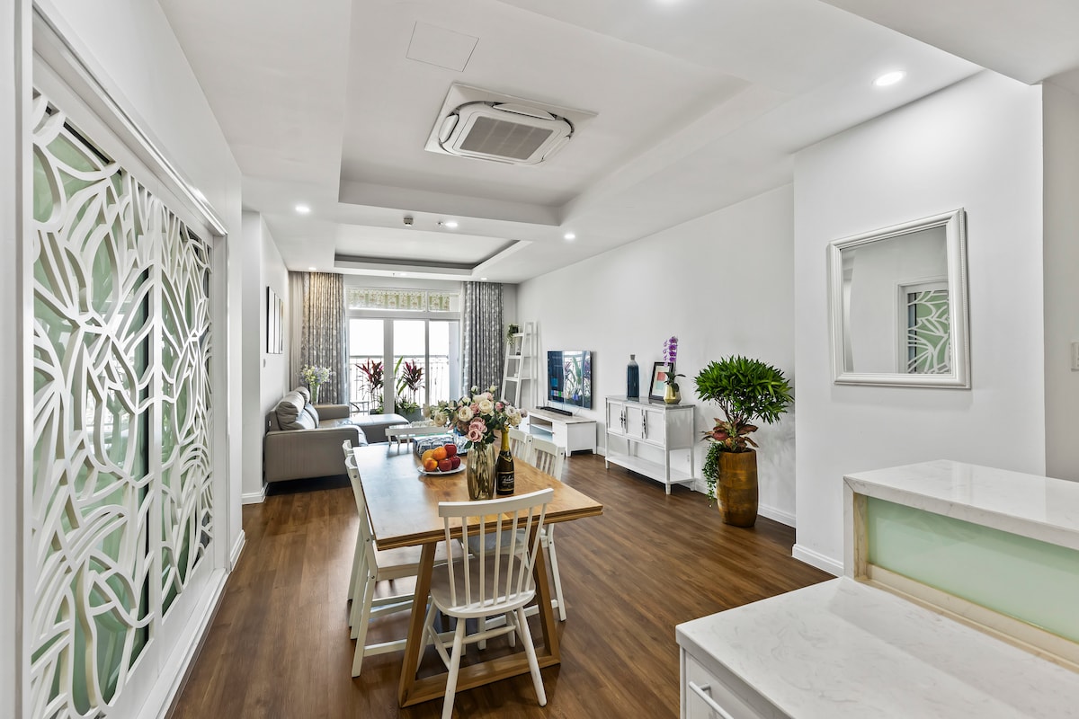 Serene, light-filled space with panoramic city views. Captures sweeping city skyline views that inspire focus and reflection—perfect for the ambitious professional seeking a stylish, uncluttered haven amid the urban pulse. With its warm Japandi elegance— subtle neutral tones, and airy open spaces—this thoughtfully designed two-bedroom retreat feels like a private sanctuary, blending modern Hanoi energy with timeless calm. Your elevated base for meaningful work and quiet recharge.