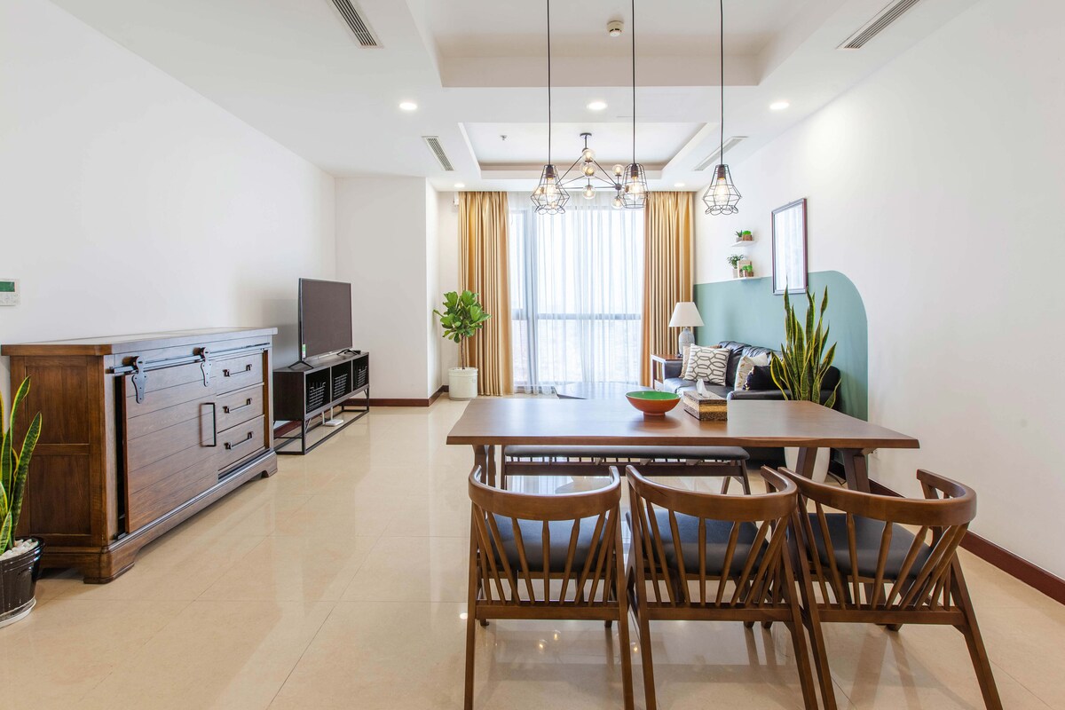 El apartamento con una superficie de más de 110 m2, se encuentra en la zona urbana de la ciudad real de Vinhomes, que tiene una ubicación céntrica. En el complejo urbano, se encuentra el centro comercial más grande de Vietnam, pista de patinaje sobre hielo cubierta, zona de juegos infantiles. El apartamento es adecuado para familias que viajan debido a su proximidad a lugares divertidos. Y apto para huéspedes de negocios debido a que es conveniente moverse entre ubicaciones.