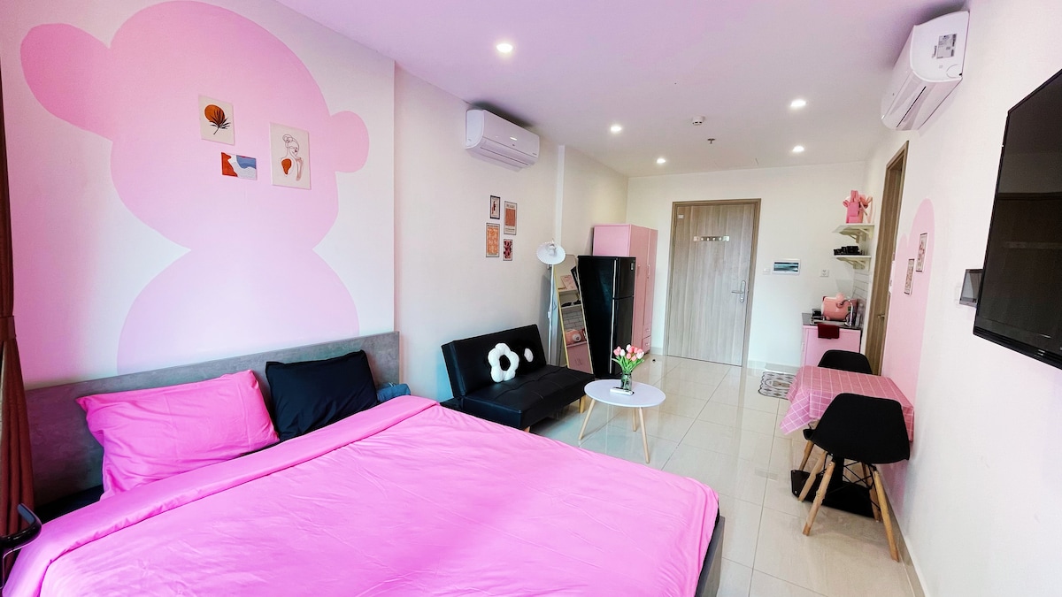 El apartamento tiene vistas a la tranquila piscina de bonsái. El apartamento está completamente amueblado, adecuado para que los huéspedes se queden desde unos días hasta 1 mes. Hay un área de cocina lista para cocinar cómodamente y limpia. Las mantas, sábanas, almohadas, colchones, toallas, gel de ducha, champú,se limpian todos los días. Los servicios públicos están disponibles con piscina, zona de juegos, mar artificial,muchas tiendas convenientes. Puedes hacer el check-in por tu cuenta o ser guiado directamente por el equipo de consultoría,con entusiasmo,experimentarás la sensación de estar en tu segundo hogar