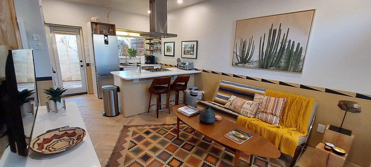 Este raro garaje para dos coches de principios de siglo es ahora un apartamento tipo estudio muy bien equipado. Sus espacios abiertos pero definidos te dejan sintiéndote relajado, mientras que funciona muy bien como campamento base para tus exploraciones de Albuquerque y más allá. Viene con una cocina acogedora pero de alta gama. El espacio del baño es pequeño pero con mucho estilo. Algunos pueden encontrar el espacio del baño desafiante. Situado al norte del centro de la ciudad, en la periferia de una zona residencial tranquila. Hay muchos cafés, cervecerías y cafeterías a poca distancia a pie.