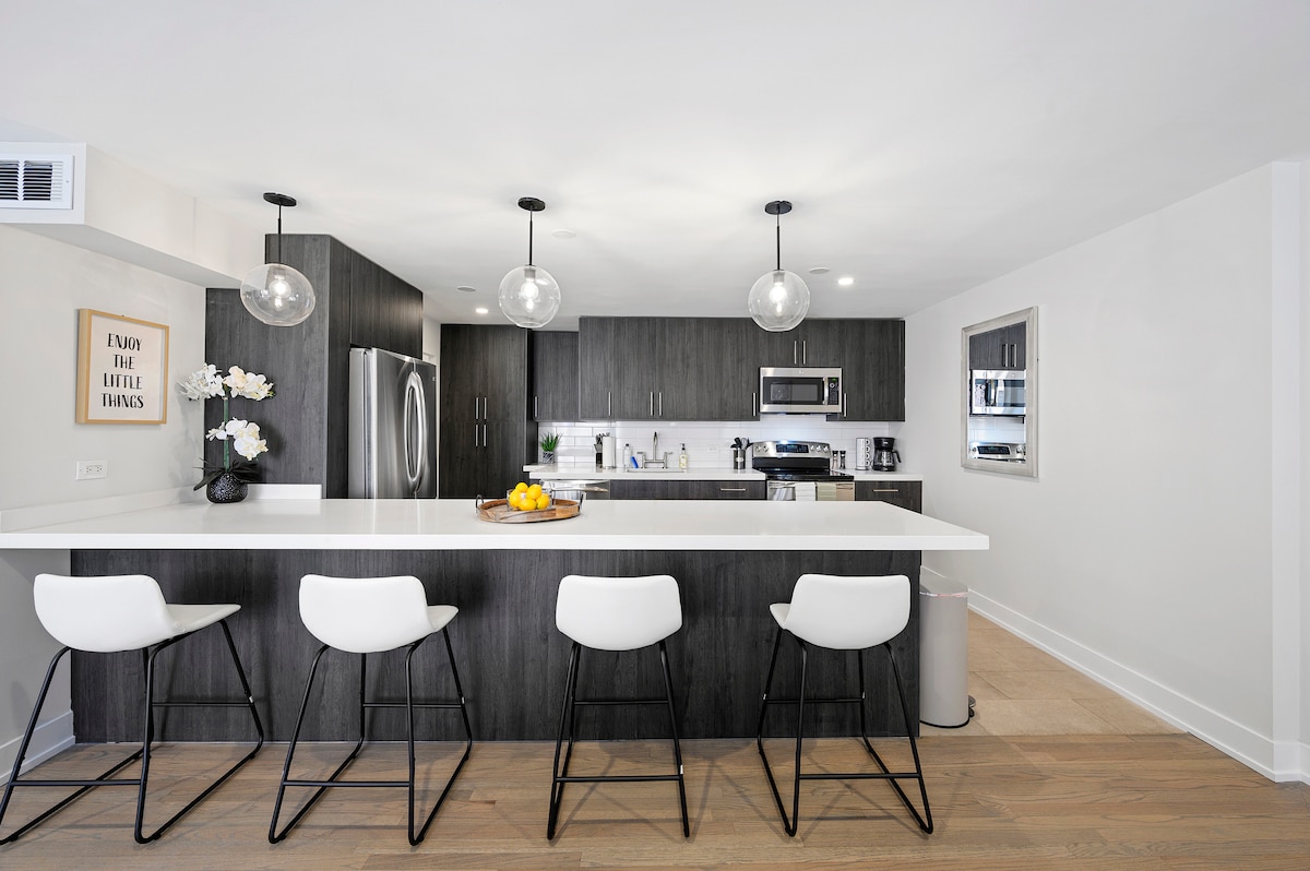 Disfruta de Chicago en nuestro moderno y espacioso loft de 1 dormitorio en el South Loop. ¡Ubicación céntrica para Grant Park, Soldier Field, Museum Campus, McCormick Place y mucho más! Nuestra ubicación tiene una puntuación de tránsito y paseo de 97, lo que proporciona un fácil acceso a todos los puntos de interés de tu itinerario. Disfruta de una encantadora luz natural, techos lujosamente altos y espacio para alojar a todo tu grupo. ¡Los huéspedes siempre se sorprenden gratamente por el tamaño del espacio y las comodidades modernas que ofrecemos!