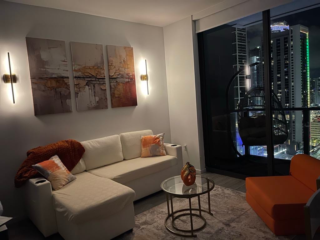 Welcome to our stylish 1BD apartment on the 46th floor with breathtaking city views. This modern space is perfect for up to 4 guests, featuring a king-size bed in the bedroom and a comfy sofa bed in the living room. The apartment is fully equipped with a kitchen, high-speed Wi-Fi, washer/dryer and all essentials for a comfortable stay. The building offers top-tier amenities including a gym and pool. Located in the heart of Miami, you’ll be minutes away from top attractions, dining, and shopping.