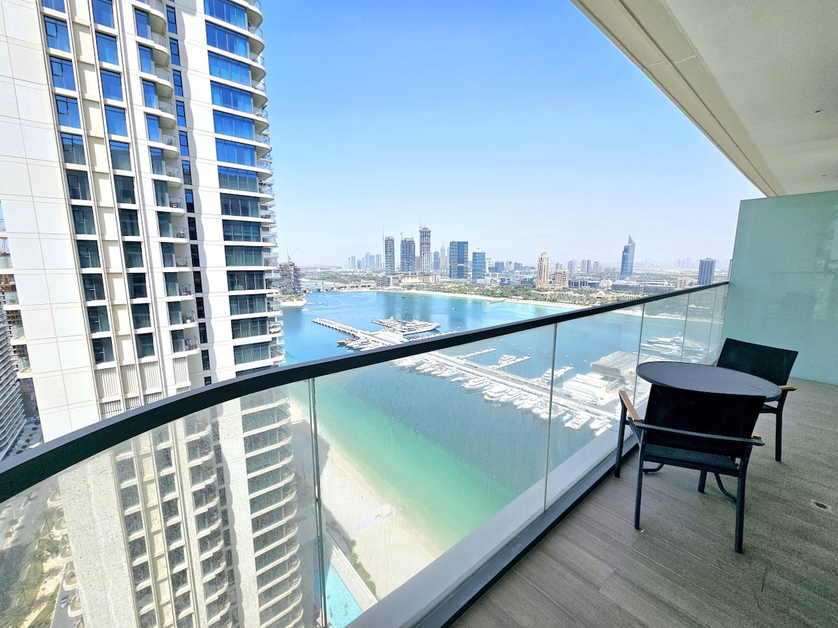 Un apartamento 1BR de lujo diseñado por interiores y acogedor con electrodomésticos nuevos, muebles elegantes, muebles elegantes y suaves y elegantes vistas y espectaculares de Palm Jumeirah. El departamento está ubicado en el corazón de la animada playa de Emaar, recientemente desarrollada, donde los huéspedes pueden disfrutar de instalaciones de última generación. Estos incluyen un gimnasio totalmente equipado, una impresionante piscina infinita con vistas al puerto, piscina para niños, acceso directo a dos playas privadas, salas de reuniones, zona de barbacoa y parque infantil.