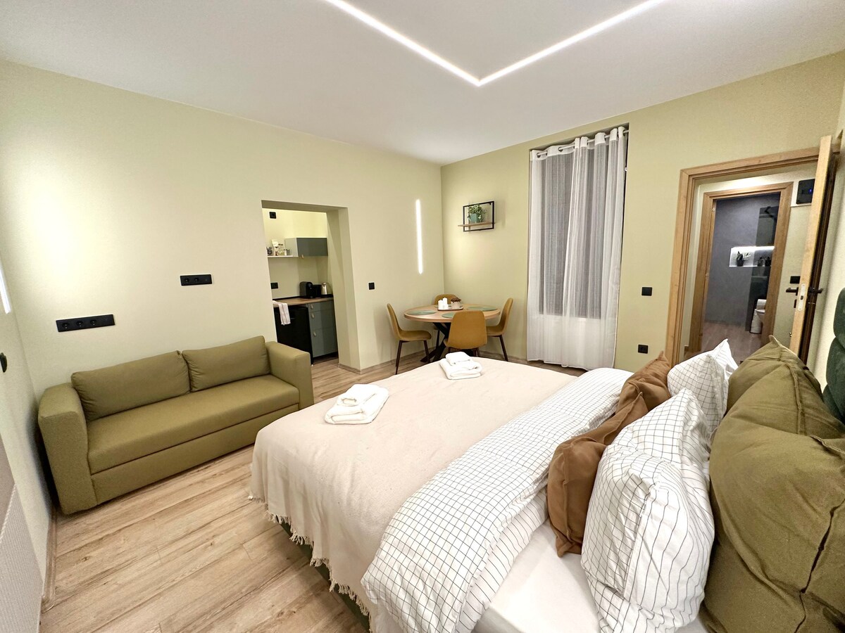 Si eres un amante de los libros y un entusiasta del arte, mi departamento es EL lugar ideal para ti. Moderno apartamento elegantemente amueblado en la planta baja de 2 habitaciones con balcón exterior. Amplia sala de estar con cocina/mesa de comedor plegable incorporada. Cuarto de ducha con w.c. Calefacción central en todas partes. Puertas de patio grande al balcón con espacio para sentarse al aire libre. Televisión y wifi instalados. Cerca del centro de la ciudad y a poca distancia a pie de las tiendas cercanas. Espacio de estacionamiento privado.