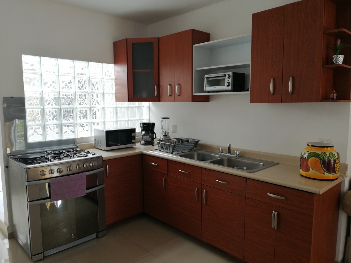 Elegante y cómodo departamento en planta baja Ideal para estancias de descanso o trabajo. Cuenta con 2 recámaras con camas matrimoniales, baño completo equipado, cocina integral (refrigerador, microondas y parrilla), sala con TV y comedor. Incluye lavadora, secadora y estacionamiento. Ubicado en fraccionamiento privado con vigilancia 24/7. Ambiente tranquilo y seguro. Se emiten facturas.