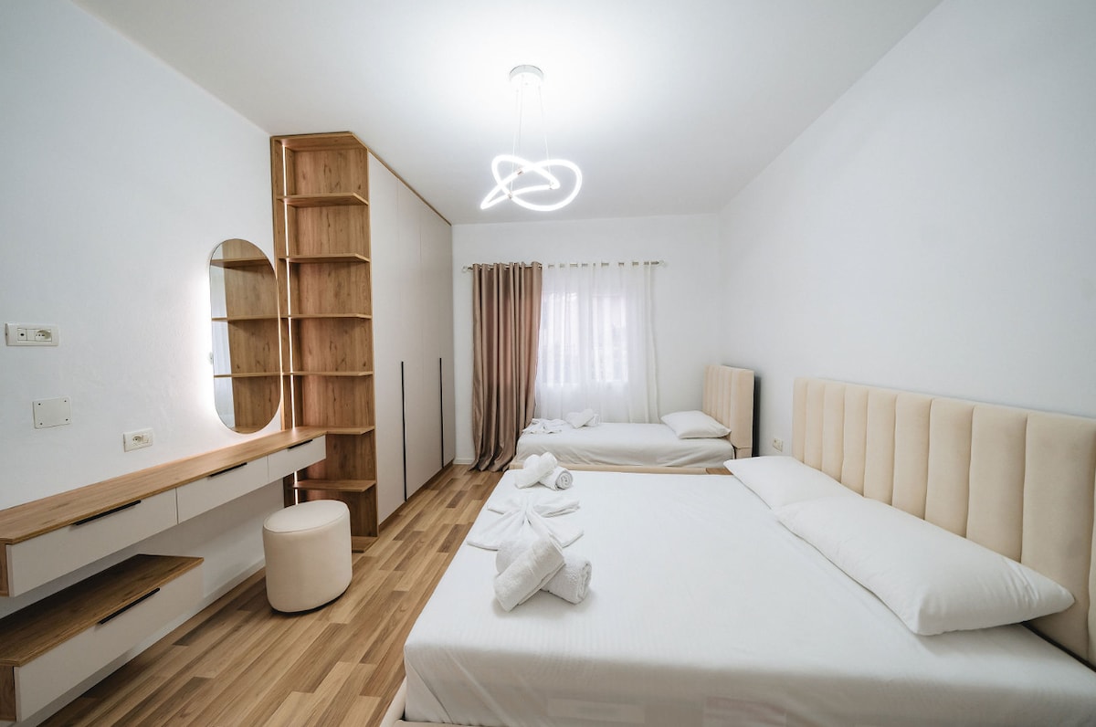Gran apartamento en el corazón de Tirana, con excelentes vistas, iluminación natural y con una amplia terraza en la planta superior desde la que se puede ver la ciudad (por la noche el cielo es mágico). Un diseño moderno con un toque de calidez de madera y habitaciones amplias. Situado a solo 4 minutos a pie del centro y con conexión a través de todas las calles principales de Tirana hace de este apartamento una buena elección para los huéspedes que quieran experimentar la cultura de la ciudad museos, parques, restaurantes y la vida nocturna de Tirana.