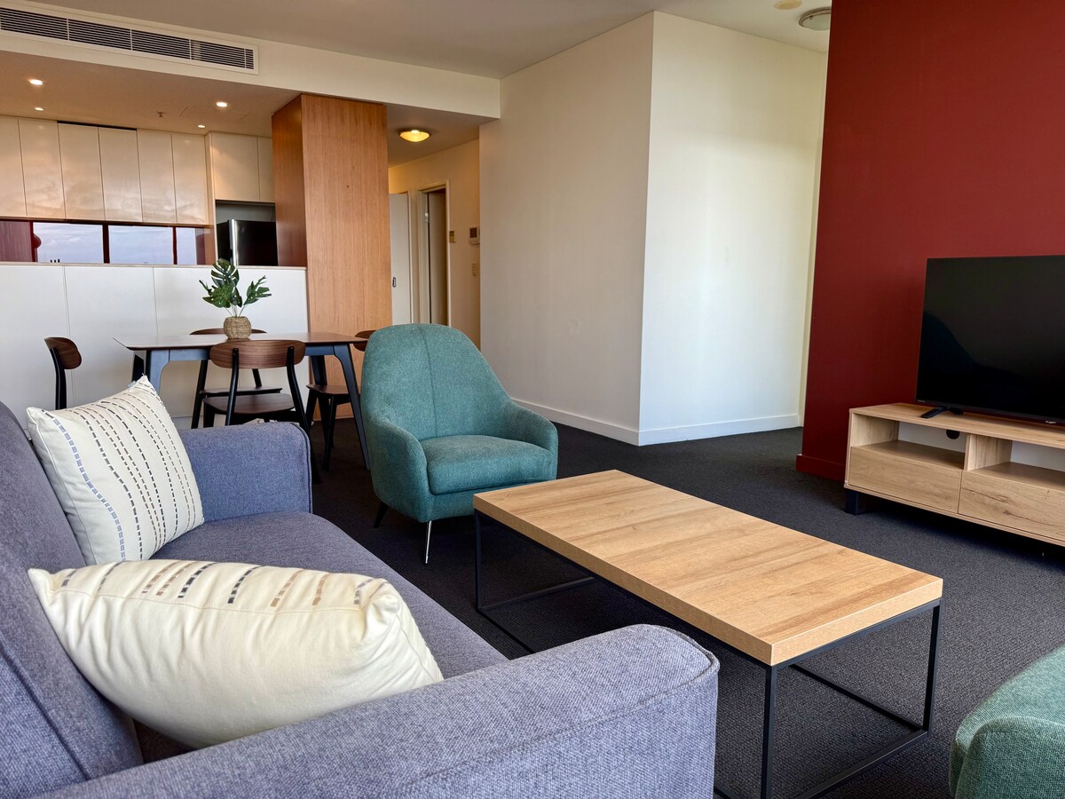 Es ideal para una escapada cerca de casa, una alternativa para teletrabajar o para familias. Apartamento de alta gama con vistas a la ciudad y 2 plazas de aparcamiento. Nivel alto con amplias vistas a la ciudad. Woolworths está abajo. A solo 5 minutos a pie de la estación de tren. 2 dormitorios, ambos con 2 camas tamaño queen y sofá cama extraíble. Ventanas con vistas a la hermosa ciudad de día y de noche. Piscina y gimnasio en el edificio. A poca distancia a pie del centro comercial Westfield, supermercados y más de 100 restaurantes. A 20 minutos en tren del centro financiero de Sídney.