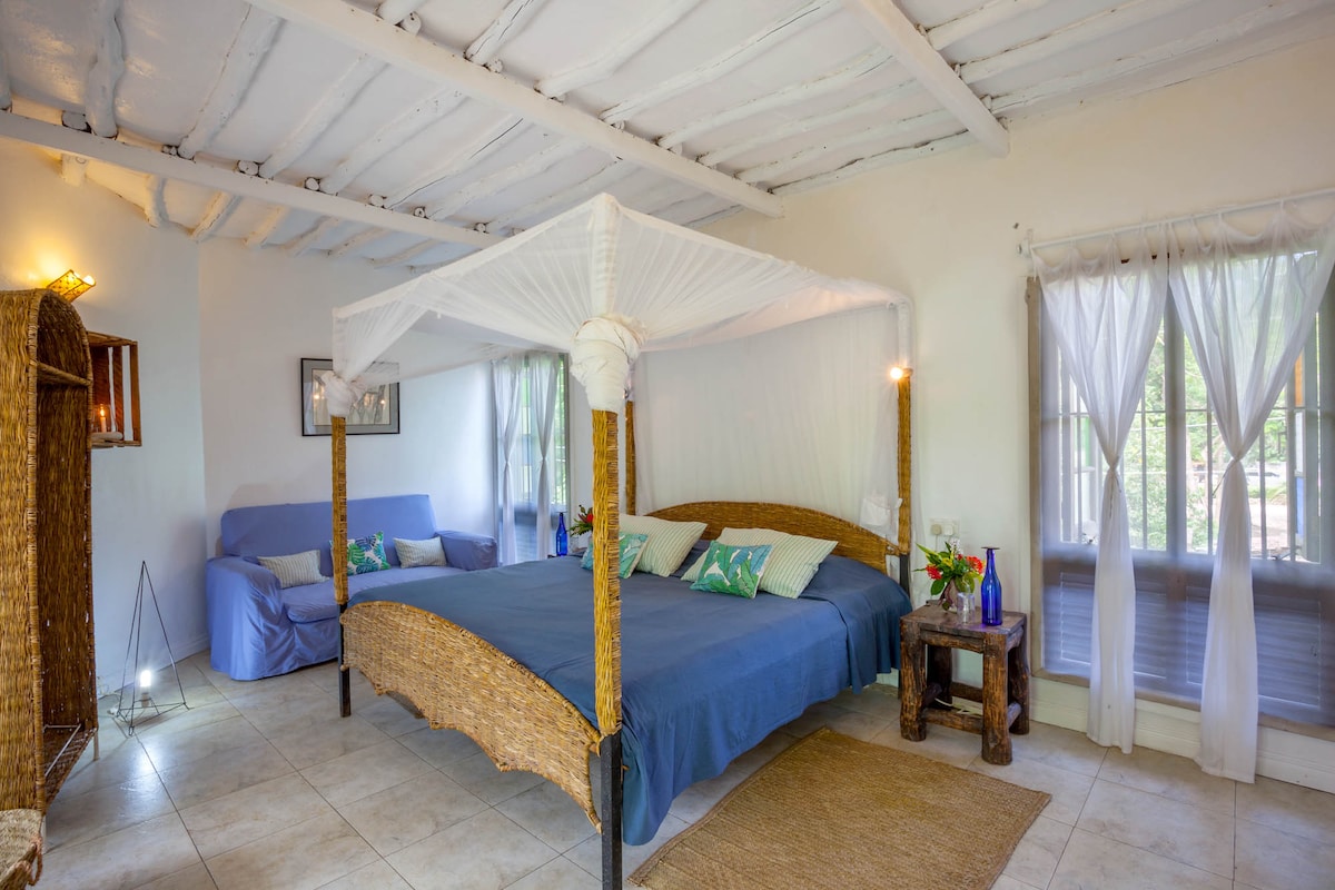 Este conveniente apartamento de planta abierta de un dormitorio es ideal para una estancia larga o corta. Se encuentra en una impresionante propiedad frente a la playa. Tiene un amplio dormitorio privado con una cama doble. Hay 2 sofás cama opcionales que están equipados con ventilador y mosquitero. Se proporcionan toallas frescas y ropa de cama y mantenimiento de la casa dos veces al día. El wifi de Internet es gratuito.