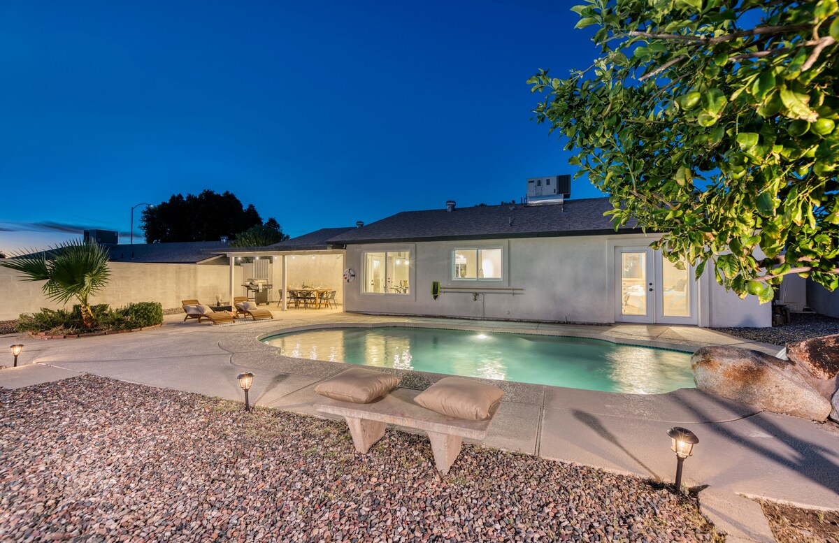 Relax with your family & friends at this gorgeous 5 bedrooms, 2.5 bathes with sofa bed, located in the highly desirable North Mesa near shopping, dining, closed to 202 freeway. This recently remodeled two-story home has a Saltwater heated pool. Covered patio with outdoor furniture. The interior is stocked with modern leather couch, 8' billiard table, exotic accent chairs. PLEASE SEE (Other details to note) if you want inquire heated pool during your stay.