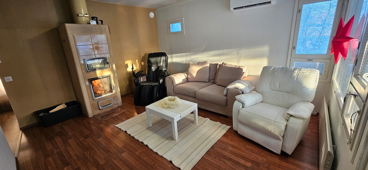 Tämä rivitalon päätyasunto tarjoaa rauhallisen yösijan kerätä voimia seuraavan päivän koitoksiin, omia akkuja ladaten. Täällä voit ottaa shiatsu hieronnan Brainlight tuolissa samalla takan ääniä kuunnellen ja loimua ihaillen. Isosta saunasta pääsee vilvoittelemaan katetulle takaterassille. Tarjoamme vieraille kahvit sekä teet ja keittiöstä löytyy tarvittavat välineet ruuan laittoon isommallekkin perheelle. Autopaikkoja yksi tolppapaikka sekä toinen asunnon edessä.