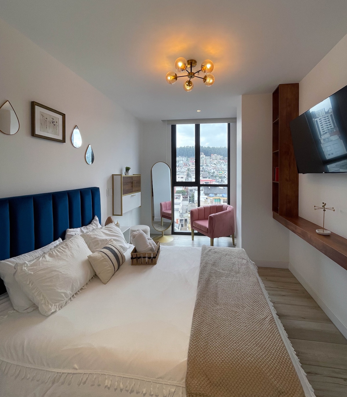 Estudio moderno y nuevo en el piso 14 con vista directa al Parque La Carolina. Amenities del estudio: • Wifi de fibra óptica • TV QLED Smart 55” • Cama ultra cómoda • Cocina equipada • Baño moderno • Smart lock • Seguridad 24/7 Áreas sociales (piso 17): • Gimnasio • Área de coworking con WiFi • Sala de juegos • Área BBQ • Jacuzzi (uso disponible solo para estadías mayores a dos noches) Ubicación estratégica, a 15 minutos del Metro de Quito, malls y restaurantes.