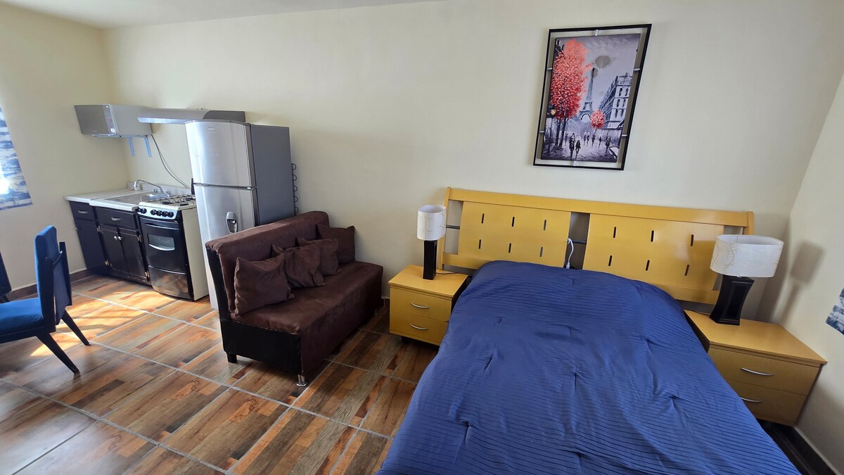 Moderno y equipado departamento, tipo loft, con lo necesario para una estancia agradable. Se encuentra al sur de la ciudad sobre avenida principal, a 5 min de la central de autobuses, cercano a supermercados, parada de transportes frente al departamento, a 10 min de la zona centro en automóvil. Con cerradura inteligente para una llegada rápida y segura. OJO: Está sobre una calle transitada, así que aveces puede escucharse ruido del exterior qué no está bajo nuestro control.