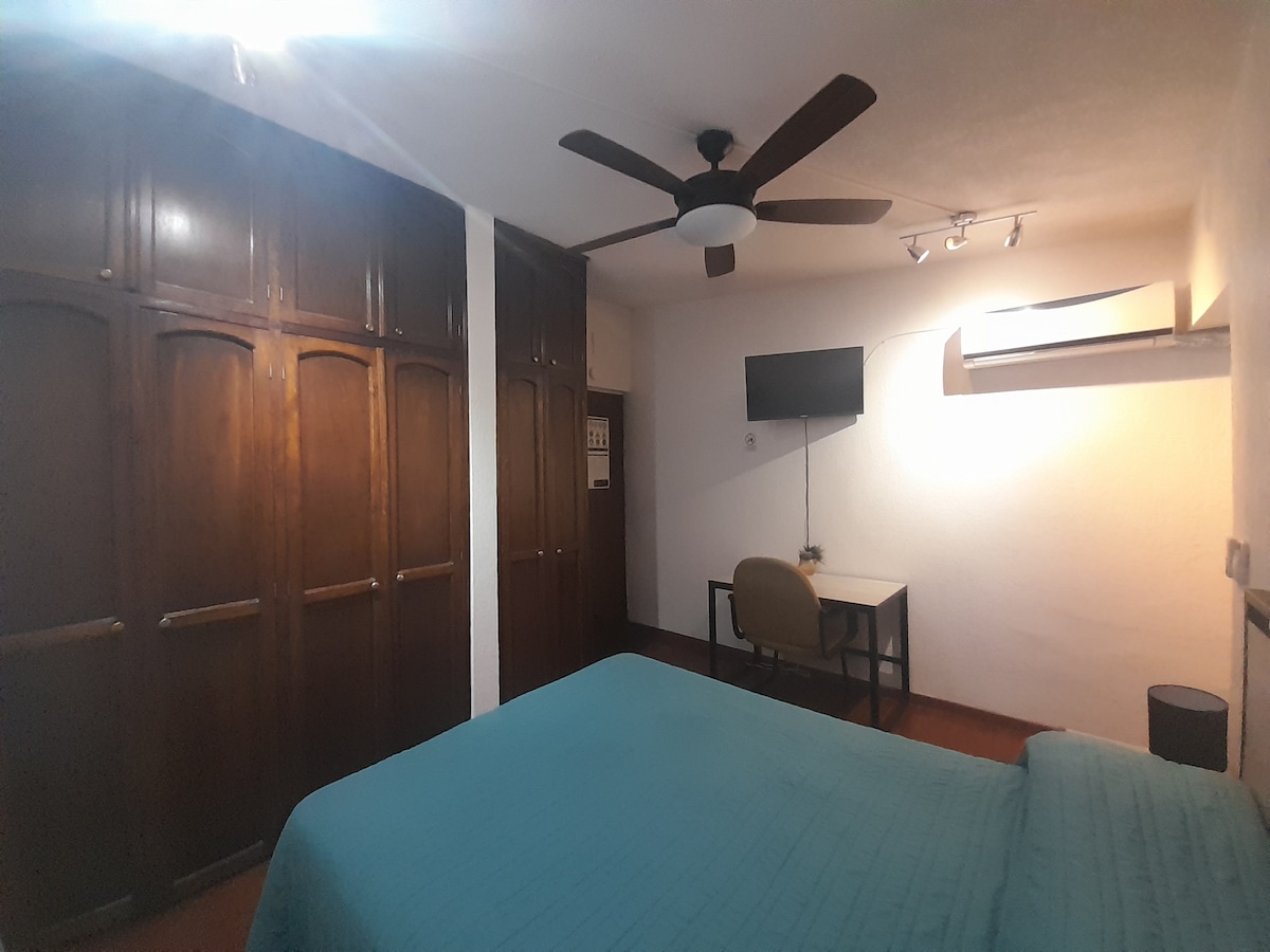 En este alojamiento tendras tu espacio ideal para un buen descanso contando con una excelente ubicación, un acceso totalmente independiente, un lindo baño para tu uso exclusivo, un amplio vestidor así como un área de coffe break (frigobar, microondas, cafetera) además de hosts que te podrán guiar en recomendaciones que necesites. Capacidad 1 huésped. (Huésped adicional genera costo extra)