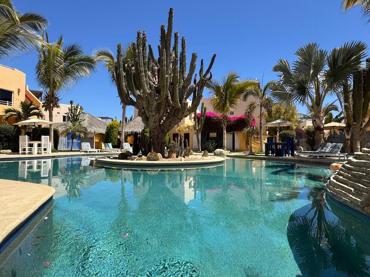 ¡Vistas épicas desde todas las direcciones! Te sorprenderá la belleza de Baja California Sur desde este apartamento a estrenar, elegante y totalmente equipado. Disfruta de un café en la terraza mientras contemplas el amanecer sobre las montañas. Después de tu día surfeando y nadando en la playa de Cerritos (a solo unos minutos a pie o en coche), relájate en el jacuzzi mientras el sol se pone sobre el Pacífico. Con vistas sin obstáculos desde todos los ángulos, tienes la garantía de ver ballenas durante la temporada. Más privacidad que en los apartamentos.