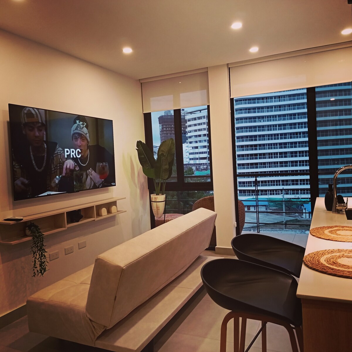 Disfruta de la sencillez de este nuevo alojamiento tranquilo y céntrico. Estrena nueva suit con un estilo moderno y confortable a pasos deI mar ubicación estratégica. Ideal para parejas o familias, este espacio ofrece una experiencia cómoda y relajante para hasta 4 huéspedes. Cuenta con 1 dormitorio Cama Queen y un Sofá Cama 2 plz, sala, comedor, baño completo y cocina completamente equipada para que te sientas como en casa. Además de Piscina, ascensor, Seguridad 24/7 y parqueadero incluido.