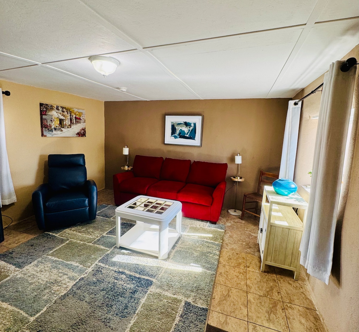 Entra en nuestra nueva casa construida en 2023, donde convergen chimeneas kiva, calidez de adobe y comodidad moderna. Abrazando el encanto del suroeste con vigas, azulejos de Saltillo y arte vibrante, nuestro espacio refleja la esencia de Taos. Situada en el vecino El Prado, la casa está a 10 minutos en coche de la famosa plaza de Taos y a menos de 30 minutos de Taos Ski Valley. Ya sea que estés de visita para esquiar, por arte o simplemente para escapar del ajetreo y el bullicio de la vida cotidiana, ¡seguro que disfrutarás de la magia del suroeste de nuestro hogar!