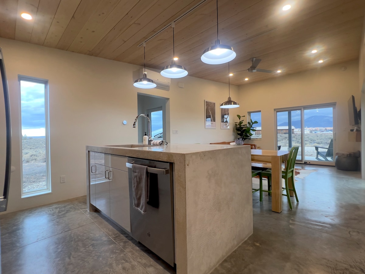 Located in the world-famous Greater World Earthship Community, this modern off-grid home is one of a kind! Built by hand over 8 years by me, your host, Kirsten. This sustainable house is bright, light, and airy with clean lines and unique details. Like all Earthships this house is built from natural and repurposed materials such as used automobile tires, cardboard, old cans and bottles. All electricity for the house is from solar. All water is from the sky. More comfort, less hippie.