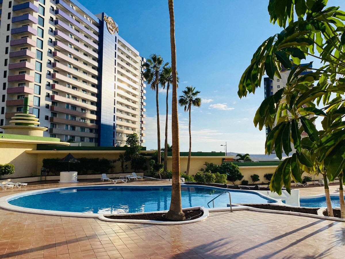 Precioso estudio en Playa Paraíso con vistas estupendas al océano y La Gomera. Completamente renovado y equipado. Edificio con piscinas y salida a la playa. Todos los servicios al lado (bares, restaurantes, supermercados). El nuevo Hard Rock Hotel enfrente. ATENCIÓN: Desde el 16 de junio 2025 hasta finales de año la piscina permanecerá CERRADA por obras.