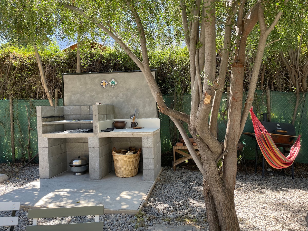 La Casita, lugar apacible inserto en una propiedad arbolada, 10.000 metros cuadrados de nogales y almendros, en medio de la cordillera, bonito jardin con terrazas y piscina, preciosa vista y cielos estrellados. Cómodo living comedor con cocina completa. Está ubicada en El Ingenio a 60 km de Santiago, zona ideal para treking y bicicleta, cercana a parques nacionales, centros termales y restaurantes. Piscina y estacionamiento privados.