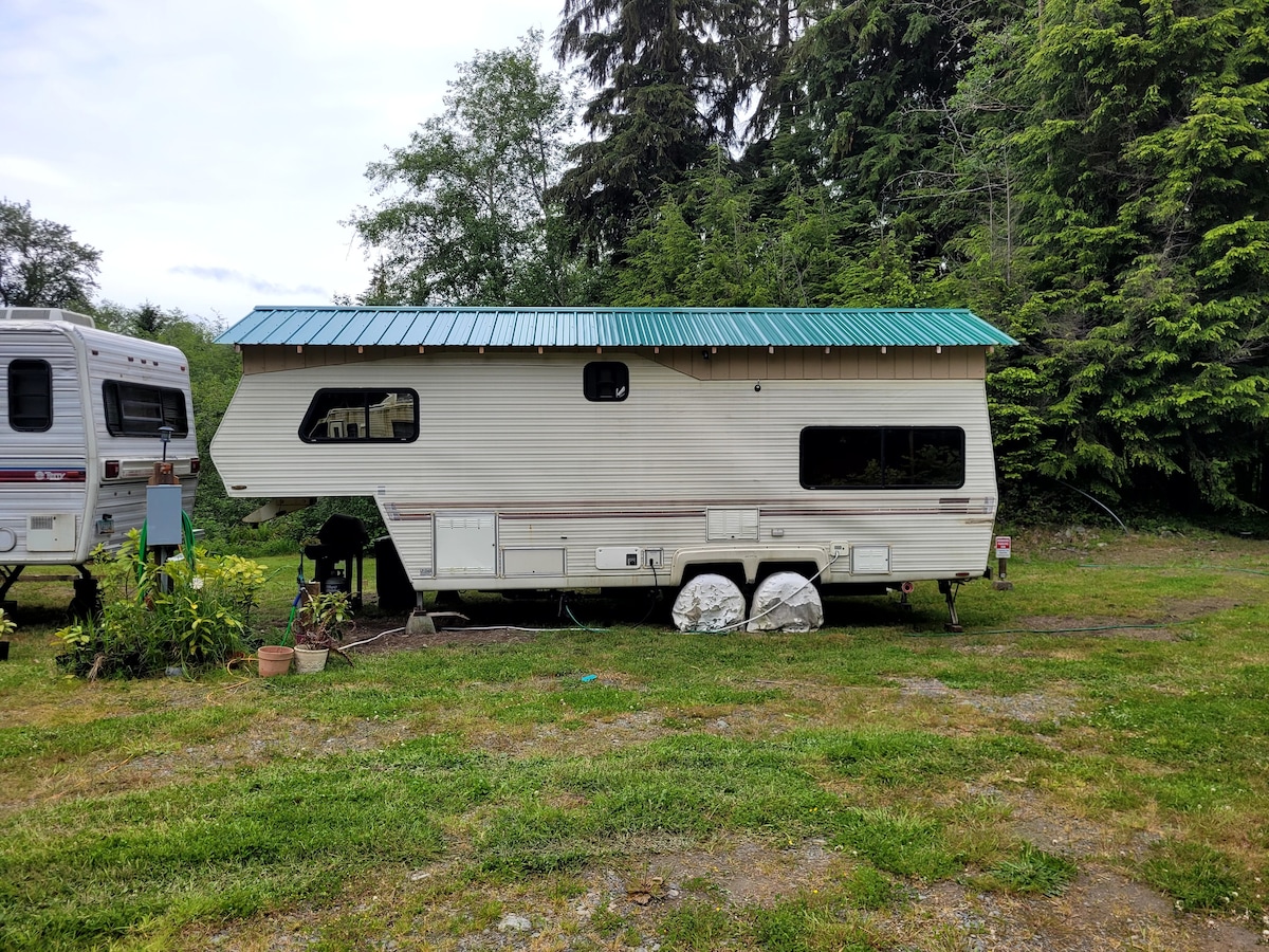 Este sitio está ubicado en las montañas entre el hermoso Port Angeles y Sequim, Washington. Aunque está al lado de nuestra casa, que está en 1,5 acres, sigue siendo muy privado y tranquilo, ya que se encuentra en la parte posterior detrás de nuestro estudio y garaje. Tu alojamiento estará en un espacioso remolque Wildwood de 26 pies de 2013. En el exterior podrás sentarte en una mesa de pícnic cubierta o alrededor de una acogedora chimenea al aire libre con colibríes y pájaros que vienen a los comederos circundantes. También hay una pequeña zona de césped para juegos de jardín.