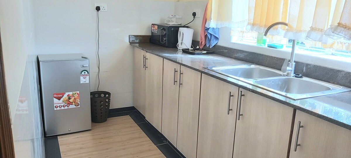 This spacious Wamara HomeStays studio is one hour to Nairobi National Park & in safe Kahawa Sukari. Has a queen bed, Wi-Fi, smart TV, Netflix, a well equipped kitchenette & a spacious bathroom. It overlooks the front yard; with an event room & a babycot available on request. Enjoy serenity, evening walks, visit a great gym & swimming pool next door. Cook or order food online or dine out in nearby major Malls. A personal welcome on arrival. Beyond 1 guest, there is an extra charge.