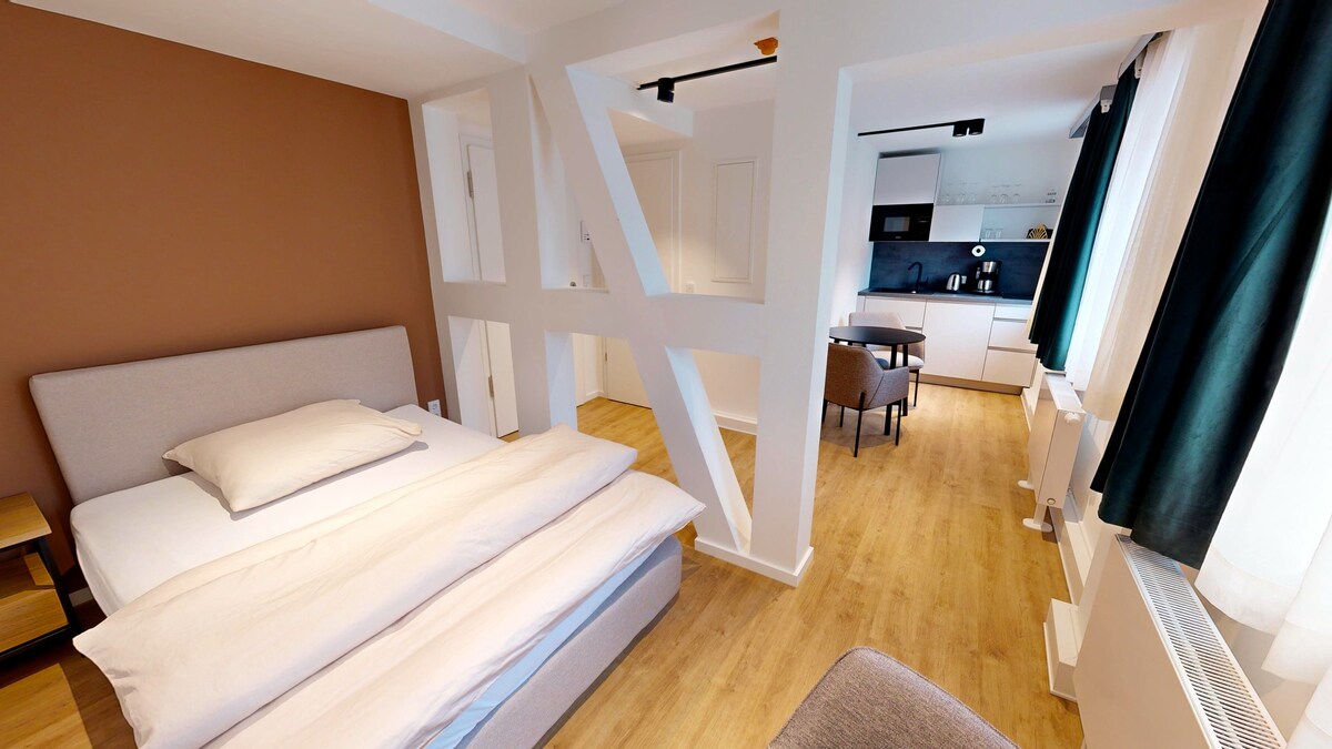 Direkt hinter den Weiden vom AZL steht das Fachwerkhaus mit dem Appartement „Carl-Otto“, das sich im Nebengebäude befindet. Im Eingangsbereich können Stall- und Wanderschuhe sowie die Jacken gleich an der Garderobe bleiben. Im 1. OG ist dann die gemütliche neue 1-Zimmer-Appartement mit Bad und Kitchenette.