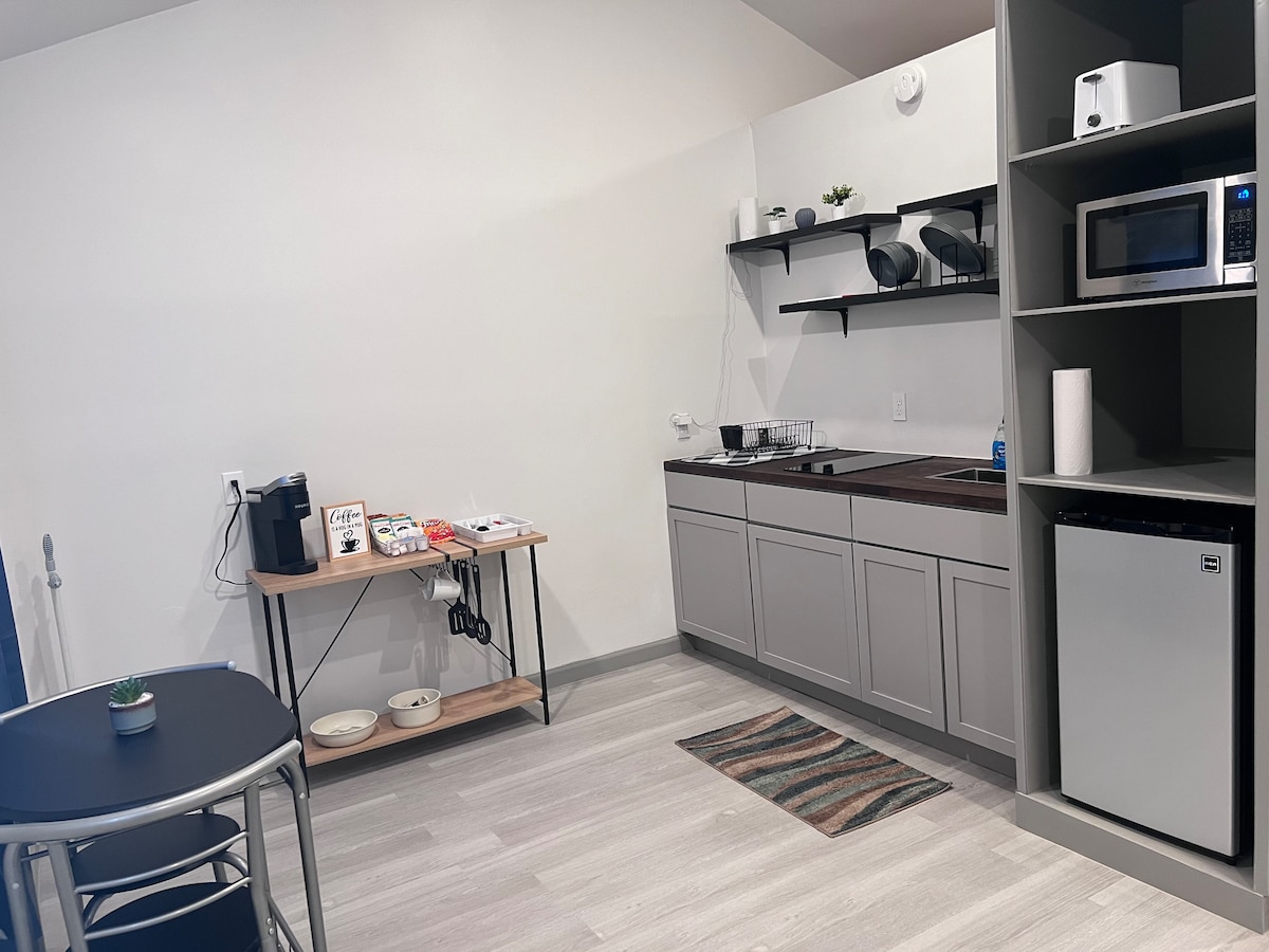Bienvenidos a nuestra acogedora minicasa ubicada en mi patio trasero cerrado, donde una cama queen de plataforma baja promete una noche de sueño reparador y nuestra cocina pequeña bien equipada facilita la preparación de comidas. Tendrás estacionamiento gratuito ubicado en el patio trasero a pocos pasos de la minicasa. Además, tendrán la oportunidad de reunirse alrededor de la fogata al aire libre para disfrutar de noches acogedoras bajo las estrellas. En el interior, relájese con un televisor inteligente y manténgase conectado con wifi gratuito.