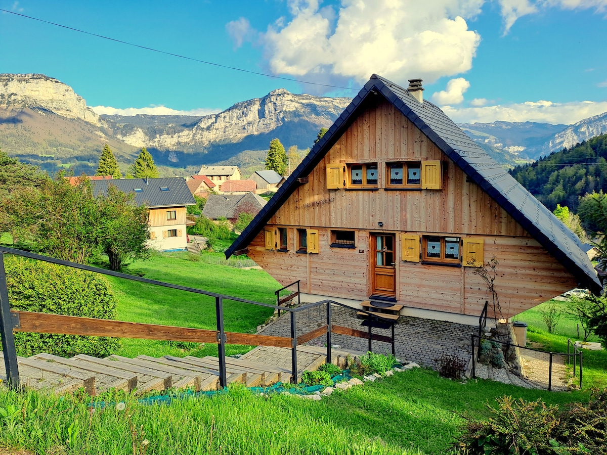 Una vista panorámica impresionante de las montañas desde el balcón, una sala de estar de madera, techos altos, un ambiente que invita a la relajación... El balcón se abre a un terreno en pendiente bordeado por un arroyo, discreto según la temporada con un fondo sonoro, el encanto discreto de las campanas. Una inmersión total en la naturaleza. Habitación íntima, aparcamiento, fácil acceso en cualquier época del año, sala de equipos. Sábanas, toallas, TV, internet de fibra. Check-in libre. ¡Ideal para un dúo en serenidad!