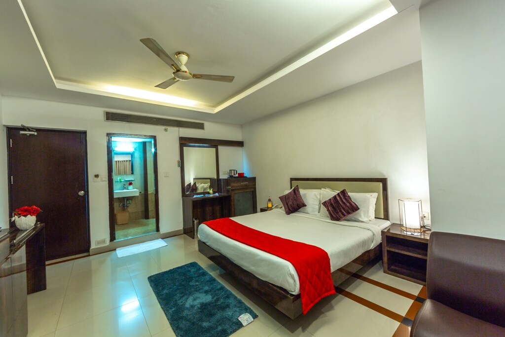 Habitación bien amueblada con todas las instalaciones modernas como TV LCD con conexión por cable, aire acondicionado, agua fría/caliente las 24 horas, 7 días a la semana. Las camas son tamaño king con colchones muy acogedores y cómodos. Los baños están equipados con todas las comodidades modernas y necesarias. La habitación está a solo un kilómetro de la estación de tren Ernakulam Junction y a un kilómetro de la estación de autobuses KSRTC.