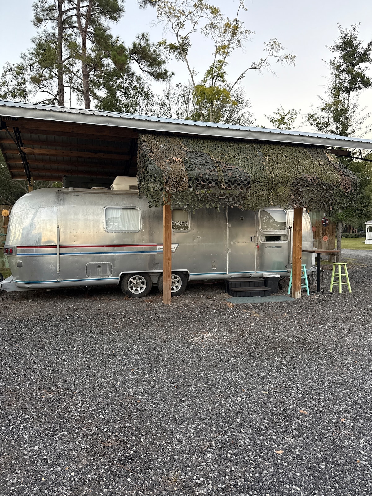 El Airstream se encuentra en más de 4 acres de FOB Pelican (temática militar) que tiene una playa, kayaks, canoas, bar cubierto al aire libre, bar interior de tranvía, bañera de hidromasaje y vistas tranquilas del pantano. A menos de 1 milla de la I-10 y a un par de millas de la histórica Milton. El airstream tiene un sofá/cama plegable estilo RV (tamaño queen) que acomodará a 2 adultos. Tenemos un sobrecolchón de espuma disponible para aquellos a los que les guste una cama más suave. También hay una cama individual.