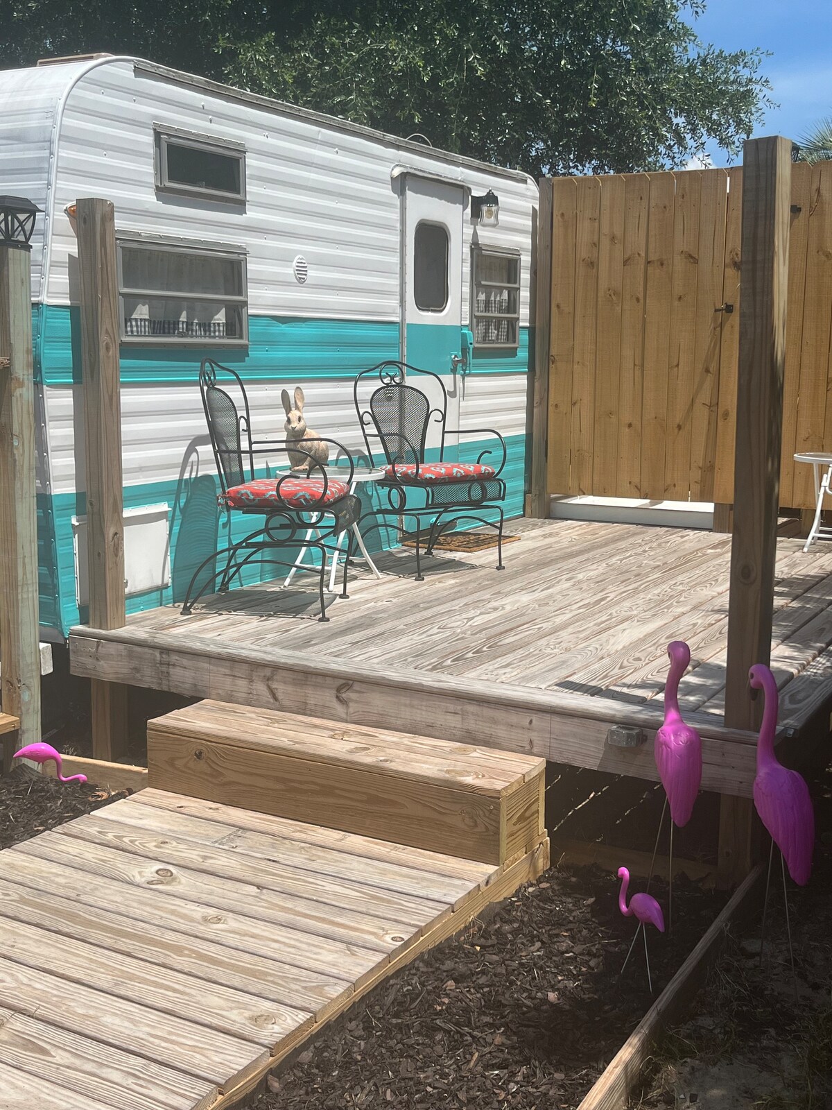 Disfruta de un elegante remolque de viaje privado renovado con todos los servicios que necesitas. Se admiten mascotas por una tarifa, se permiten 1 perro grande o 2 pequeños. De bajo coste para que puedas gastar dinero en cenar fuera, actividades en la zona y recuerdos. Hay dos bicicletas disponibles para dar un paseo en bicicleta por las zonas vecinas. A solo 9 millas de Navarre Beach y de restaurantes locales. Hay suministros de playa disponibles para tu uso, como tumbonas, toallas, nevera portátil y un carro. También tenemos tablas de paddle surf en alquiler.