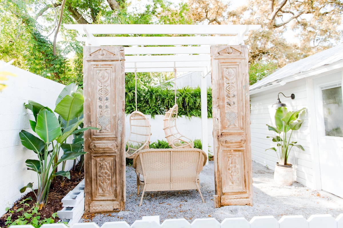 The photos don't capture this; tropical palms overhead, butterflies everywhere, string lights waiting for evening.Step through the gate.. your cypress cottage with treehouse style loft. That 100-year-old clawfoot tub. The outdoor shower everyone raves about. Hot tub under stars. Hammock between palms. Covered deck with grill. Fenced yard for your pup. Walk to coffee, drive 15 mins to white beaches. But you'll want to stay right here.Our guests say it best: magical, restorative, transformative.
