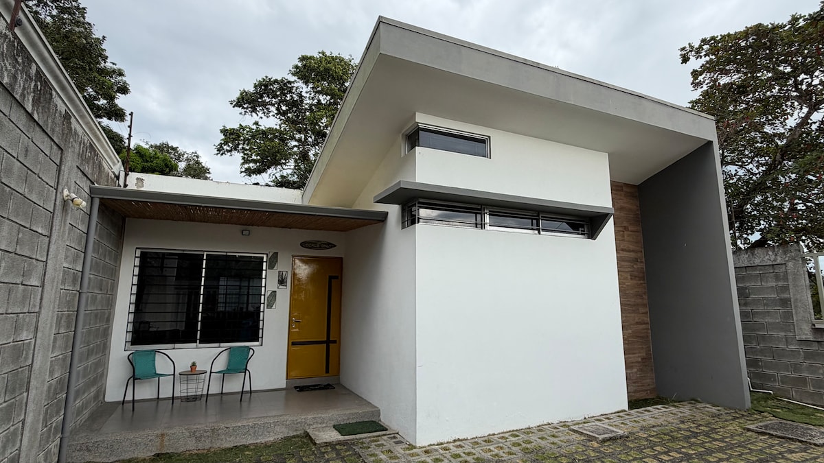 Ingreso desde las 8am. Se aceptan mascotas (2maximo) Linda casa totalmente equipada, A/C, rancho para asar y jacuzzi privado en la terraza (solo el jacuzzi cuenta con calentador). Ya que estamos ubicados en un clima tropical el resto de la casa no tiene agua caliente. Rodeada de bella naturaleza, en su jardín podrás observar diferentes aves, colibris y mariposas Lugares de interés automercado, farmacia, pizza hut, sub way, cajeros Playas Herradura Jacó Hermosa Bochinche