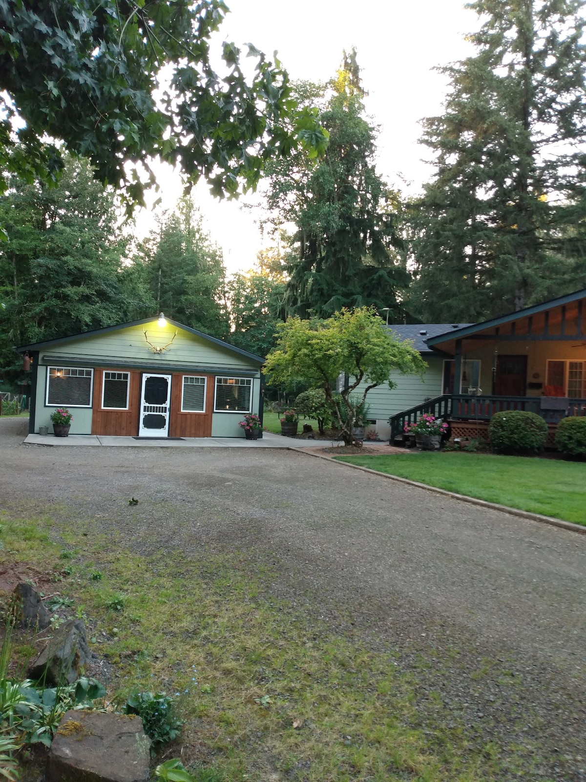 Keep it simple at this peaceful and centrally-located place. Cascade Mountains to the Pacific Ocean, Portland to Seattle . Nestled in the woods, perfect spot for whatever you have in mind. Fish, Hunt, Hike, Ski, Shop, Antiques, Art, Dine, Festivals, Lakes, Kayaking, Breweries, Wineries. Our quest house is about 600 sq ft. & sleeps 4 adults - 1 queen bed and pull-out sectional. Kitchenette complete with coffeepot, mini fridge, microwave, toaster/air fryer oven, dishes, pots and pans & more.
