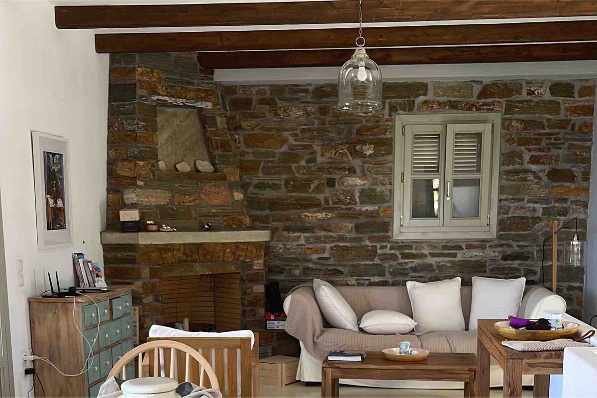 Maison en pierre et matériaux de haut standing, décorée avec goût dans le respect du style cycladique typique, vous propose un séjour de détente, rythmé par des couchers de soleil inoubliables. Les plages les plus réputées et aménagées se trouvent à proximité (2 km), ainsi qu’une plage isolée accessible à quelques minutes à pied. La maison dispose de plusieurs balcons et terrasses extérieures avec barbecue. Avec sa piscine privative, c’est l’endroit idéal pour le repos et l’intimité.